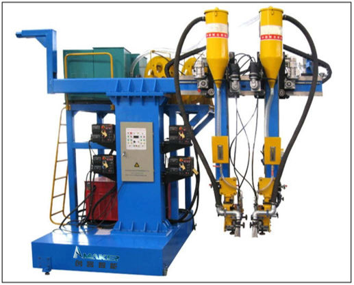 本机通过变频电机驱动系统,拖动台车整体移动, 从而带动导弧机构半衡移动,导弧机构在弹簧伸缩机构的作用下,迫使导弧轮沿船形焊缝运行。焊剂回收系统能充分而有效地将焊剂回收并分离去伪(不能用的焊渣)存真,重复使用。