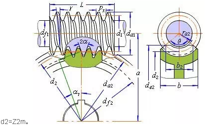 各类圆柱蜗杆传动的参数和几何尺寸基本相同。为阿基米德圆柱蜗杆传动的主要参数。通过蜗杆轴线并垂直于蜗轮轴线的平面,称为中间平面。在中间平面上,蜗杆的[1]齿廓为直线,蜗轮的齿廓为渐开线,蜗杆和蜗轮的啮合相当于齿条和渐开线齿轮的啮合。因此,蜗杆传动的参数和几何尺寸计算大致与齿轮传动相同,并且在设计和制造中皆以中间平面上的参数和尺寸为基准。